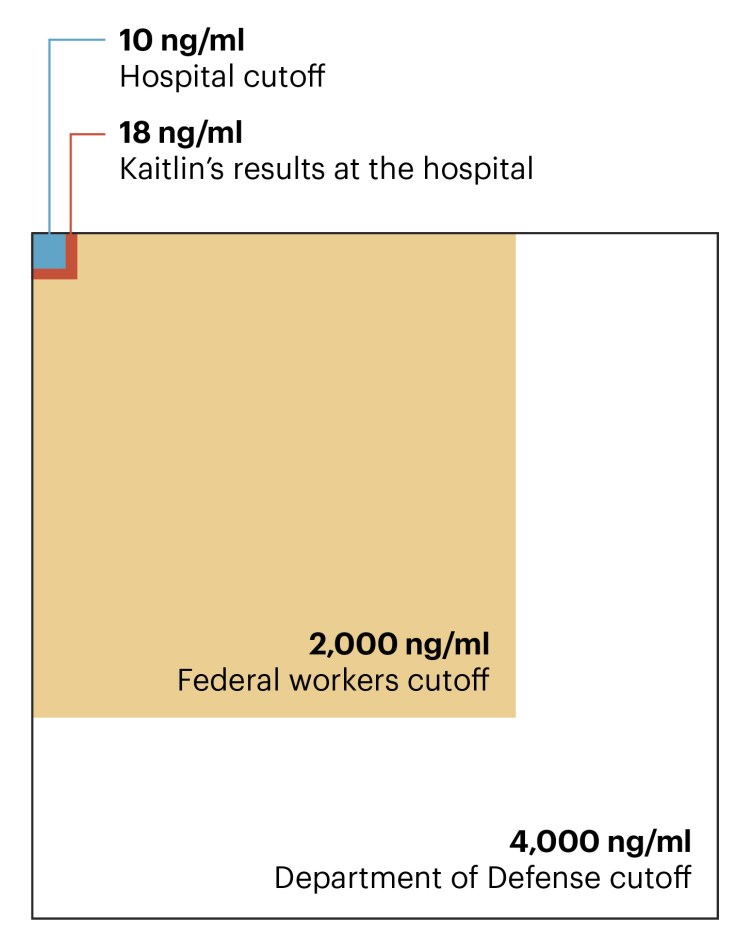 The amount of opiates that upended Kaitlin’s life — 18.4 nanograms of codeine per milliliter of urine, according to court documents — was so minuscule that if she were an Air Force pilot, she could have had 200 times more in her system and still have been cleared to fly.