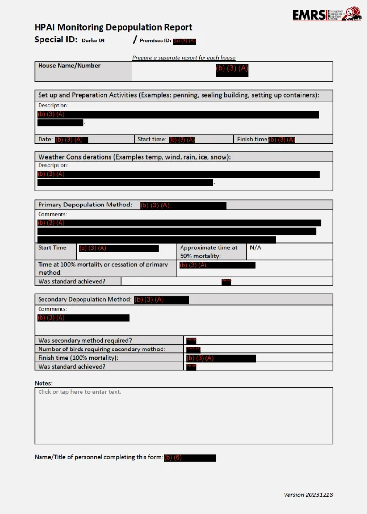 This analysis doesn’t account for how much infectious material would have actually been spreading in the environment. That would require additional information, like how many chickens were sick and at what rate. The USDA returned a public records request that likely would have contained some of those facts, but every piece of information was redacted.